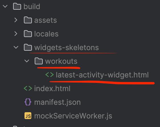 For example, in the mwa-reference project, the skeleton is saved under /widgets-skeletons/workouts/latest-activity-widget.html. The route URL for the widget’s page is /workouts/latest-activity-widget, as you can see, it matches the path in the assets folder.